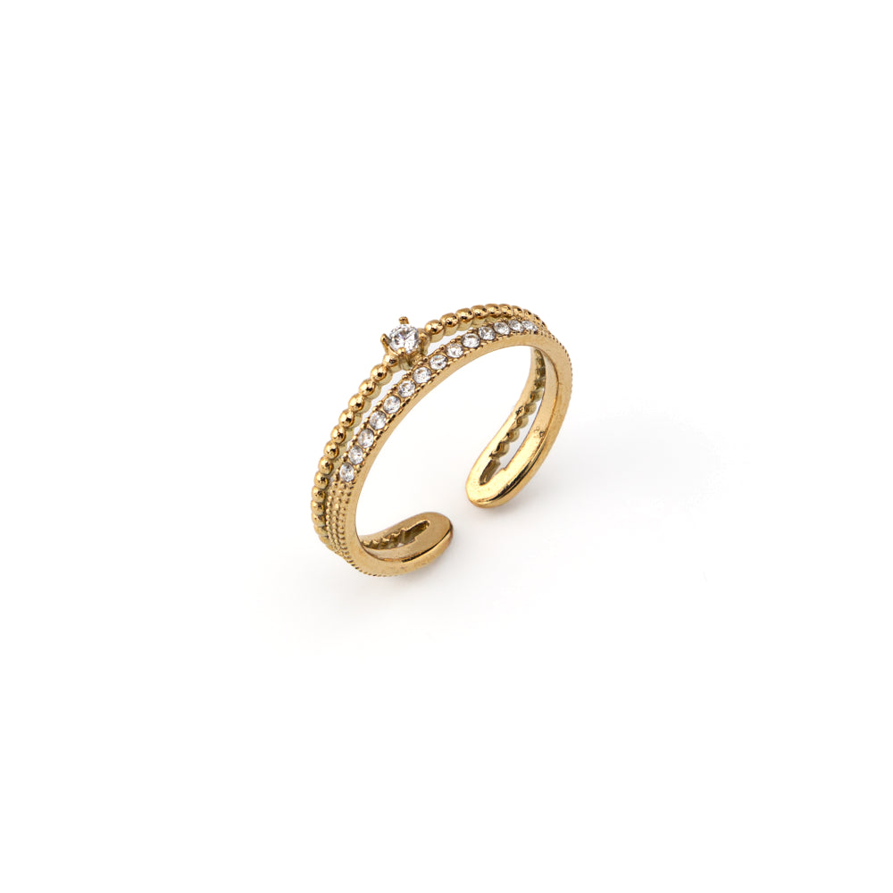 O design solitário duplo cria um detalhe visual elegante e distinto que capta a luz de forma delicada, realçando a mão com um acabamento dourado refinado. O aro ajustável permite um encaixe confortável em diferentes tamanhos de dedo, oferecendo versatilidade no uso — seja sozinho ou em mix & match com outros anéis da tua coleção. Uma escolha versátil e elegante que acrescenta um toque de estilo moderno a qualquer outfit.