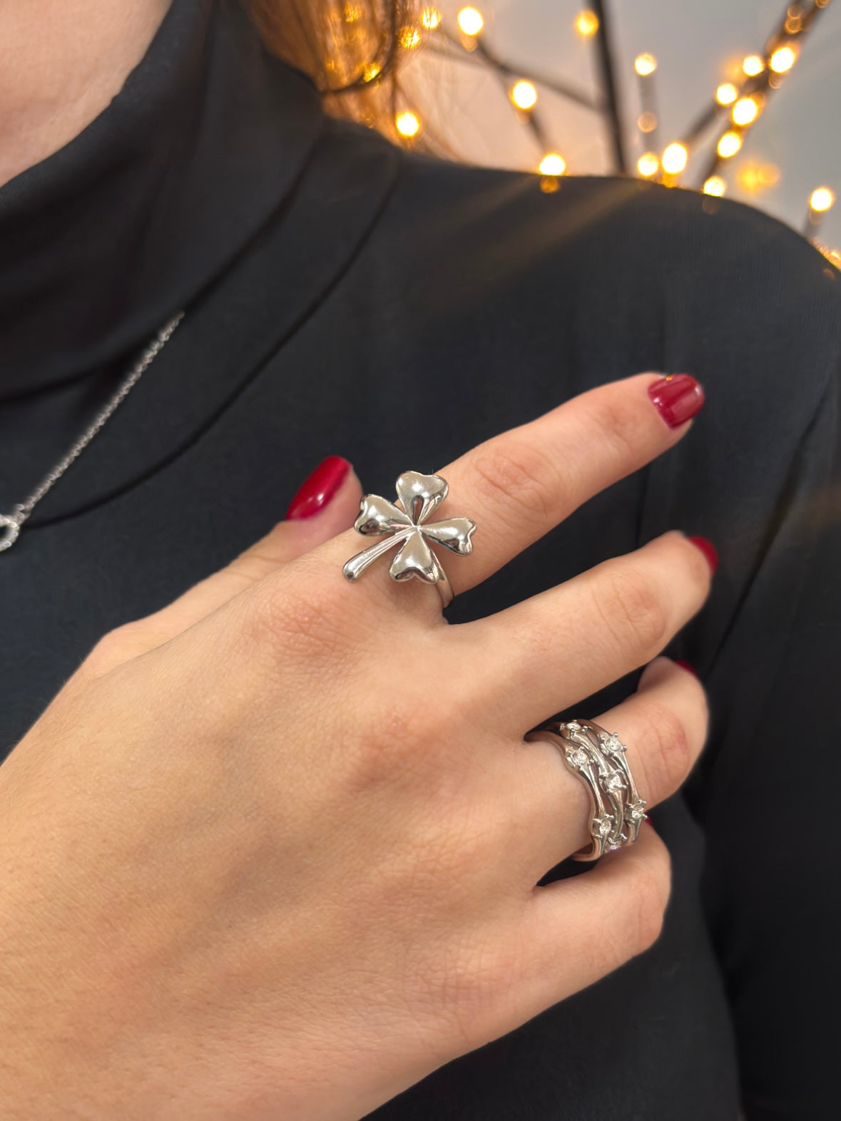 Celebra a sorte e o estilo com o Anel Trevo Prateado da Dise Jewelry. Feito em aço inoxidável 316L, este anel combina resistência e conforto com um design delicado em forma de trevo — ideal para uso diário ou como símbolo de personalidade.